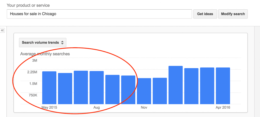 For example, take this single keyword phrase “Houses for sale in Chicago”. As on June 2016, take a look at the search volume for that keyword string below.