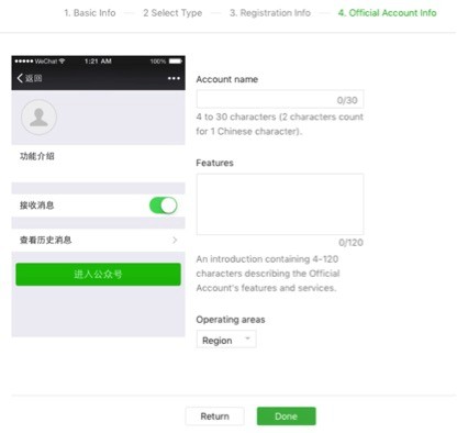 Choose the appropriate account type for business and you will be prompted to enter details about your company such as country, business name, email address, account administrator and others. Under Official Account Info, select an account name and write a short introduction for your business.